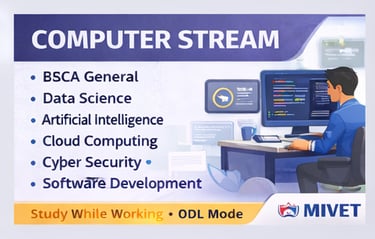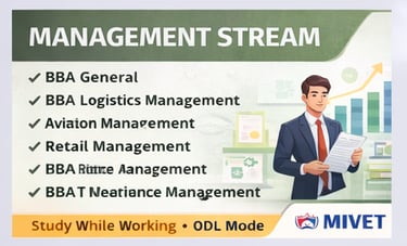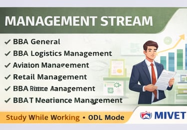 The Work Integrated Programs (WIP) offered by Madras Institute of Vocational Education and Training (MIVET) in collaboration with universities such as: Asian International University | Mangalyatan University | MATS University and much more universities are delivered through ODL (Open & Distance Learning Mode) following university regulations and applicable higher-education frameworks.